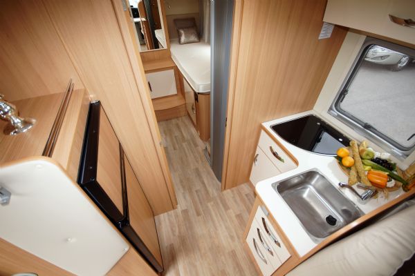 Dörren går att stänga mellan köksdelen och sovdelen och man får på så sett ett ända stort badrum. Modernt vinkelkök med 3lågig gasolspis och eltändning och mycket förvaringsutrymmen. Lucka mellan lastutrymmet bak och sovrummet.