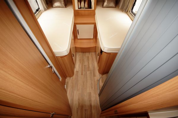 Rejäl sittgrupp med stort dinettebord som går att justera även i höjdled. Myggnätsdörr och fönster i bodelsdörren. Mörkläggningssektioner för hytten + Thermotäcke. Förvaringsfack under sängarna bak + stor garderob i mitten. Separat badrum med spoltoalett från Thetford samt separat duschkabin.