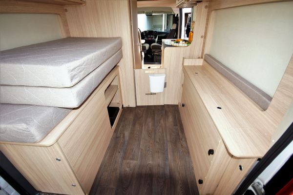 Breda sängar bak där man får plats 2 personer samt bäddbar dinette för 2 personer. 4 bältade platser. Den ena sängskivan går enkelt att lyfta upp och låsa i stående läge och man får på så sett ett rejält lastutrymme alt garage istället. Förvaringsfack i golvet. Garderob. Plats för 2st gasoltuber.