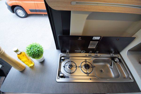 Köksbänk med flera förvaringsskåp. 2lågig gasolspis med eltändning. Badrum med handfat & spoltoalett från Thetford med tillhörande toakassett som omvandlas till en duschkabin om så önskas. Möjlighet till utedusch genom att man drar ut duschslangen genom fönstret.