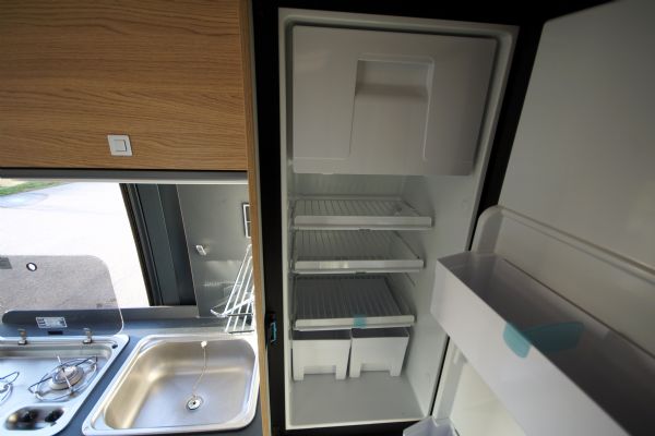 Stora kompressor kylskåpet med frysfack som drivs på 12v. Truma luftburen gasolvärme med integrerad varmvattenberedare och automatisk frostplugg som styrs via en digital manöver display. Westfalia.
