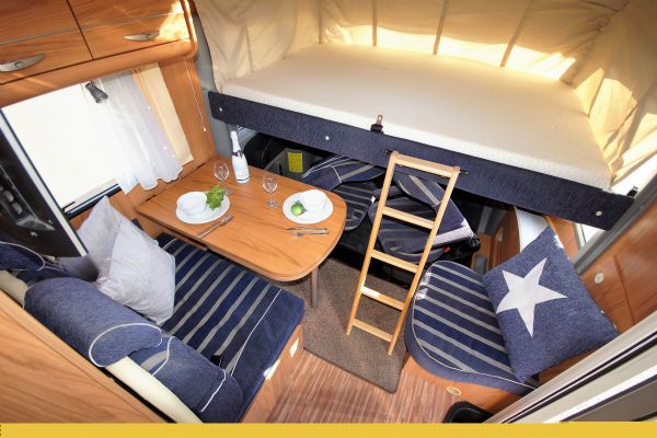 Garage bak med luckor från båda sidor. Nedsänkbar taksäng fram, Queensbädd bak med sköna kallskumsmadrasser. Totalt 4 bäddar och 4 bältade platser.